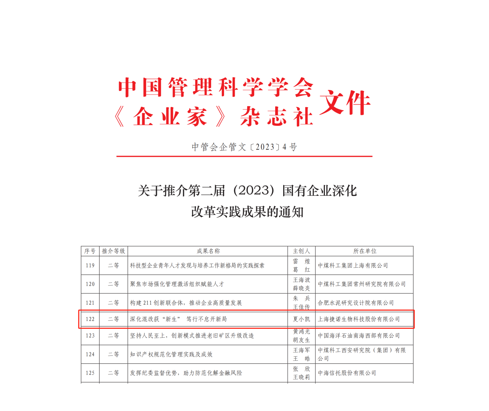近日,中国管理科学学会和《企业家》杂志社联合发布了第二届(2023)国有企业深化改革实践成果推介名单,上海捷诺生物科技股份有限公司(以下简称:捷诺生物)上报的《深化混改获“新生”,笃行不怠开新局》获评二等成果。
